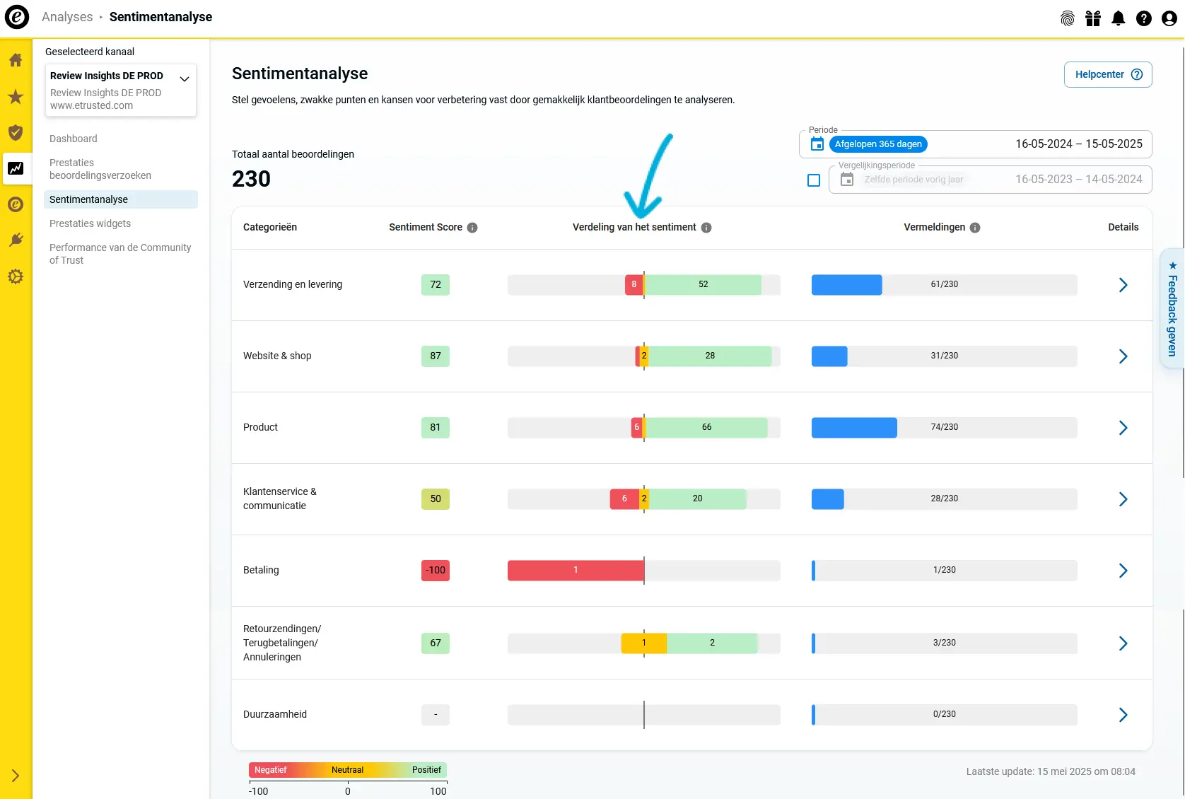 Met een tool zoals de Sentimentanalyse van Trusted Shops verzamelt en verwerkt AI alle gegevens, zodat je geen tijd meer kwijt bent hieraan. Het geeft een overzicht van de sentimentscore op basis van verschillende categorieën, laat zien hoe de verdeling is en hoeveel vermeldingen er zijn. Ook kun je een periode aangeven en vergelijken met een andere periode.