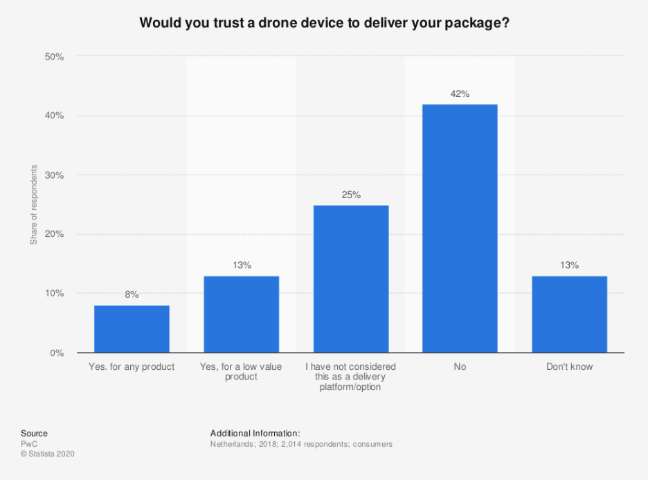 echter nog niet overtuigd. Volgens Statista (2018) is 42% van de ondervraagden duidelijk: ze zijn niet geïnteresseerd in levering per drone. Ook heeft een groot deel nog niet nagedacht over deze bezorgoptie.