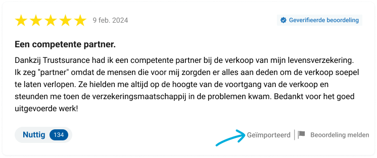 De beoordelingen die niet ouder zijn dan 12 maanden, zijn zichtbaar op je beoordelingsprofiel, samen met de beoordelingen die je via Trusted Shops hebt verzameld. Hierbij zie je het woordje 'Geïmporteerd' staan: