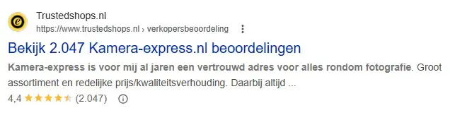 In tegenstelling tot de winkelbeoordelingen, kunnen je productbeoordelingen direct worden weergegeven naast de standaardresultaten in Google die naar je webshop linken.