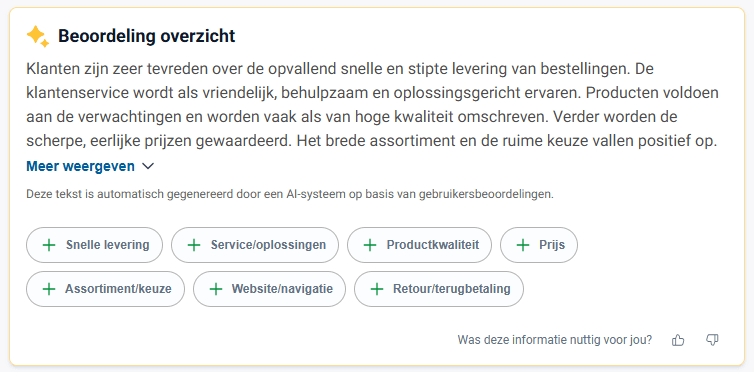 Ontdek onze nieuwe feature die een echt verschil zal maken voor je online bedrijf: Review Summary met AI. Deze AI-aangedreven tool genereert automatisch een beknopte samenvatting van je meest relevante klantbeoordelingen, rechtstreeks op je Trusted Shops-bedrijfsprofiel.