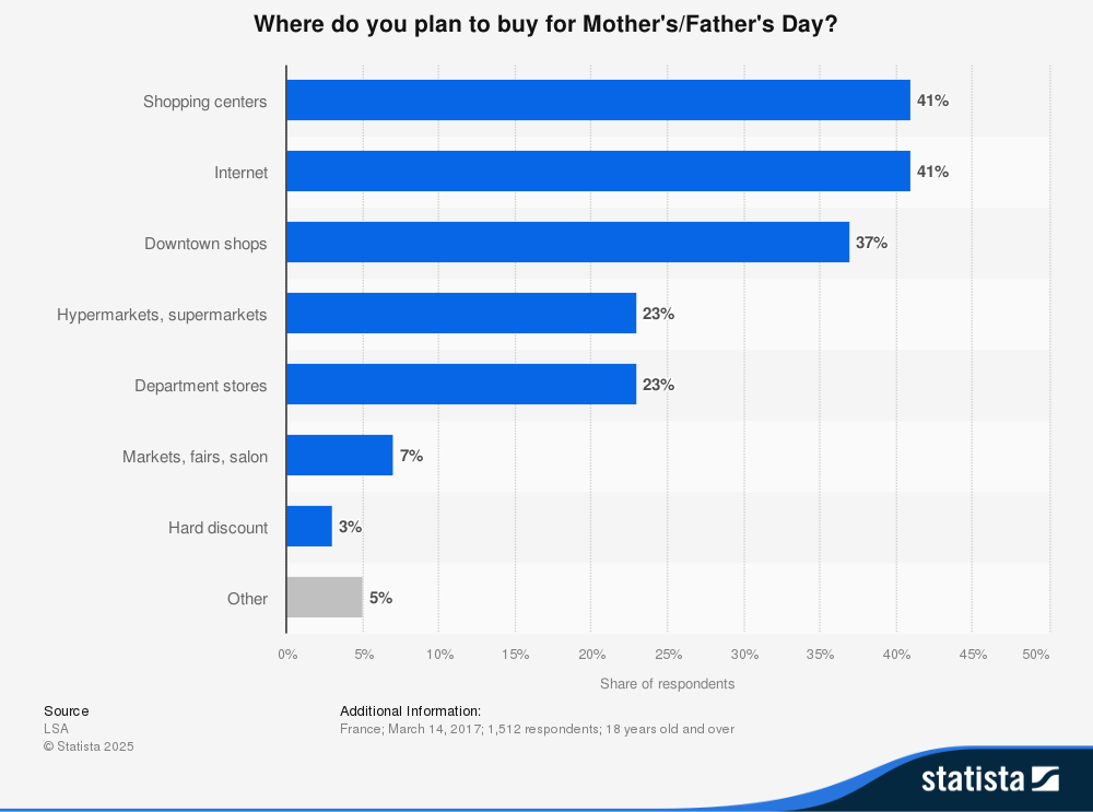 Franse consumenten gaan vaak naar traditionele winkels, maar ook een groot gedeelte shopt online voor Vaderdag, blijkt uit de cijfers van LSA/Statista: 41% shopt online. Dat is een gedeelde eerste plaats met winkelcentra!
