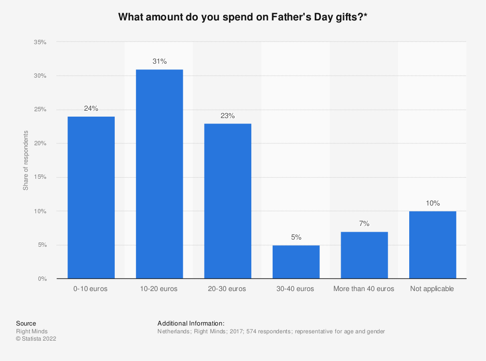 Statista heeft een onderzoek gedaan naar de uitgaven voor Vaderdag-cadeaus in Nederland. Het grootste gedeelte geeft tot 30 euro uit aan een cadeautje. Dit is goed te weten voor jou als winkeleigenaar!
