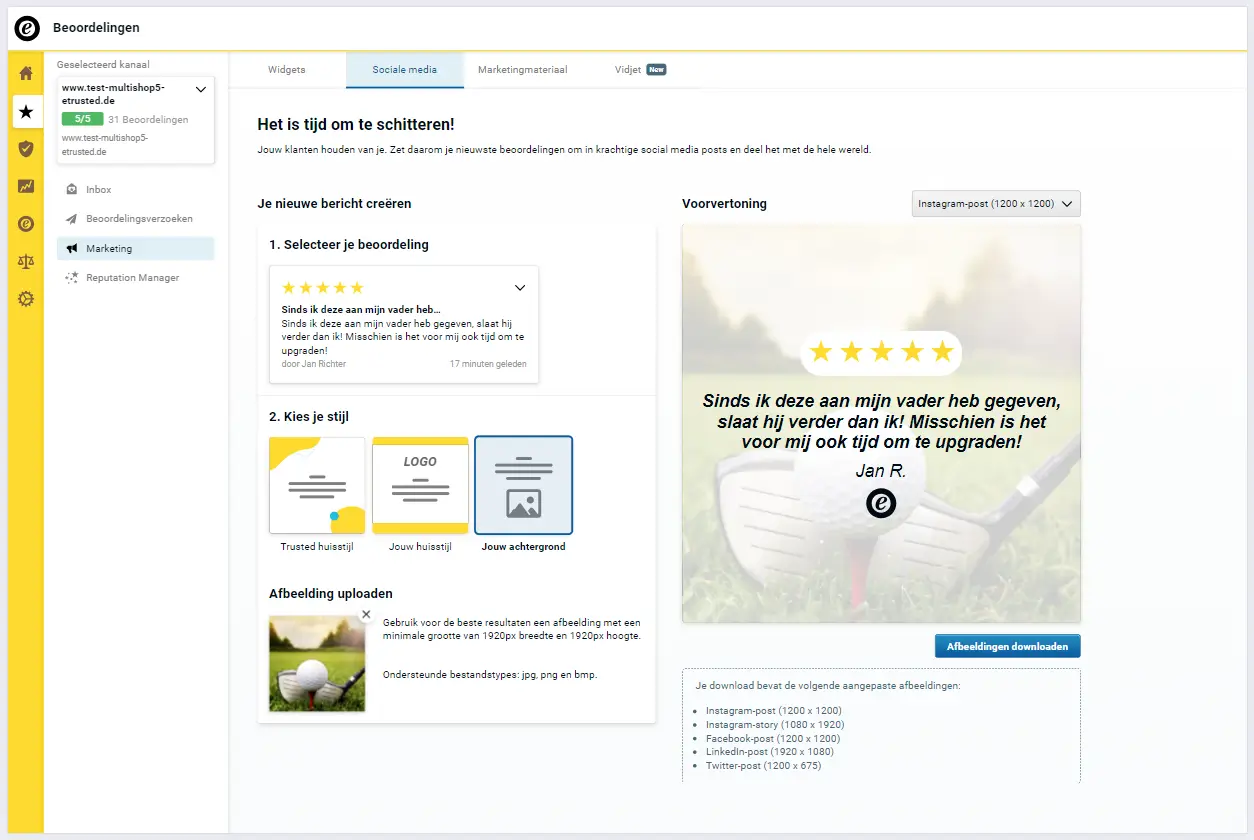 Als je provider van beoordelingen je beoordelingen laat filteren, kun je een aantal beoordelingen delen waarin 'vader' wordt genoemd. Geef je beoordeling vervolgens een visuele boost en deel ze op social media. Bijvoorbeeld via de Social Media Creator van Trusted Shops: