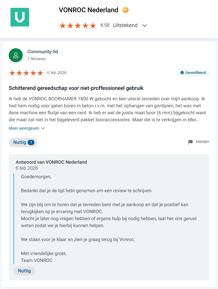 Hierboven zie je een beoordeling en reactie van onze klant VONROC Nederland op hun bedrijfsprofiel.