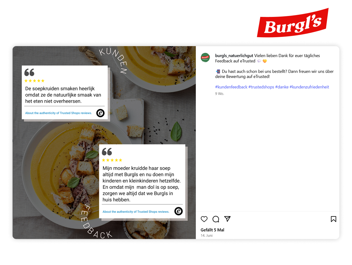 Met video’s kun je vertrouwenselementen op een krachtige en levendige manier tonen, zoals sterrenbeoordelingen, het Trusted Shops Keurmerk of citaten van klanten.